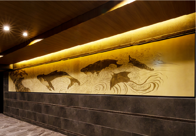 今回モチーフに選んだ鯨は、知識の海を象徴し、人間がまだ到達できない深遠な世界を示す存在です。その大きな生命が海から飛び出す姿には、夢に向かって挑戦する力を重ねました。また、エイは未来に羽ばたく学生の街という土地柄を意識し、軽やかに舞う姿を描きました。これらのモチーフを、日本画や屏風絵の構成法に基づきながら、現代的な感覚で再構築することで、伝統と革新の融合を目指しました。制作過程では、墨の濃淡や滲みを活かすため、何度も草稿を重ね、線を洗練させていきました。最終的にホーロー印刷で仕上げる際、墨の質感や偶然性をどこまで再現できるかが課題でしたが、技術との融合によって、墨のにじみまで再現できたことに驚きと喜びを感じています。